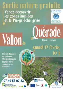 Venez découvrir les zones humides et la Pie-grièche grise dans le vallon de la Quérade à Flayat, sortie organisée dans le cadre des Journées mondiales des Zones humides avec le Conservatoire d'espaces naturels. Inscription obligatoire : 07 49 53 97 83 Prévoir chaussures de randonnée, vêtements adaptés et pique-nique. Annulation en cas d'intempérie.