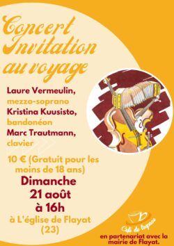Concert invitation au voyage à 16 heures avec Laure Vermeulin, mezzo-soprano Kristina Kuusisto, bandonéon Marc Trautmann, clavier 10 € (gratuit pour les moins de 18 ans)
