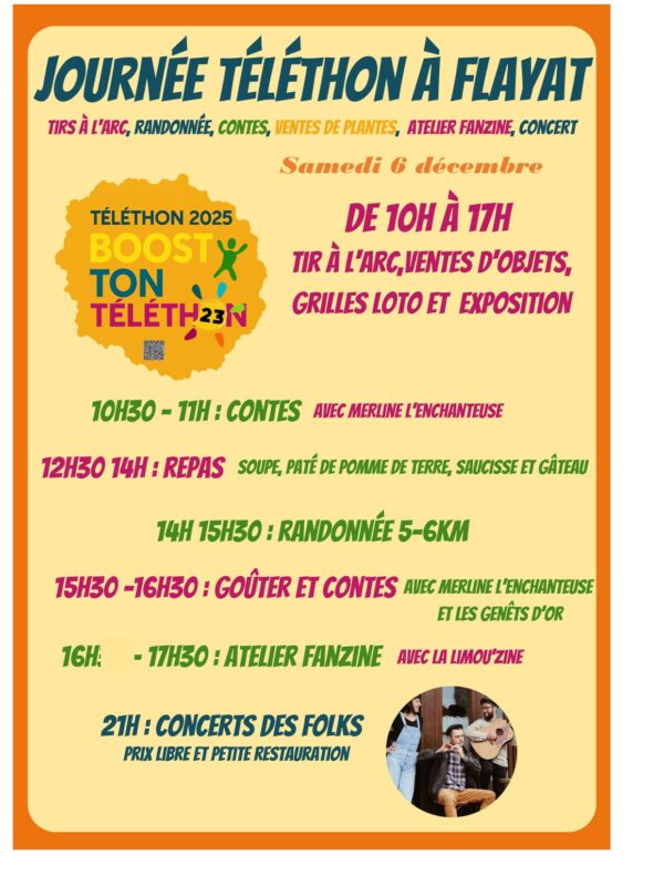 Journée Téléthon de 10h à 17h Place de l’église : tirs à l’arc, randonnée, contes, ventes de plantes, concert, atelier fanzine, repas du midi sur place.